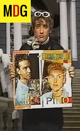 Non poteva mancare il pazziariello vestito a frischezza con la camicetta rosa e collanina improponibile che sventola un fuglietiello con delle scritte ridicole.